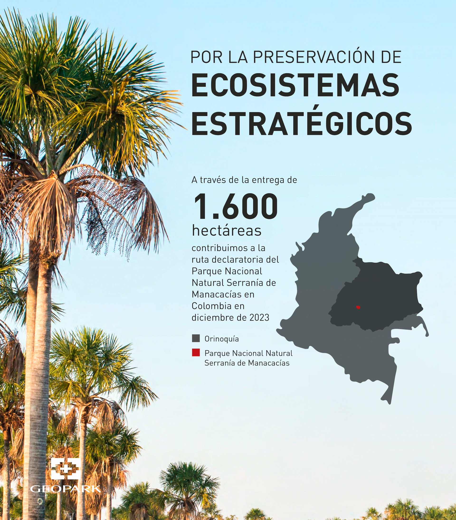 GeoPark, en el marco de su estrategia de Fortalecimiento de los sistemas de áreas protegidas en los países en los que opera, fue partícipe del proceso de declaratoria del nuevo Parque Natural Nacional Serranía de Manacacías, a través de la entrega de más de 1.600 hectáreas que serán destinadas para conservación. Esta nueva área protegida fue declarada en diciembre de 2023 y corresponde a la número 61 del Sistema de Parques Nacionales de Colombia, está localizada en el departamento del Meta y busca conservar ecosistemas estratégicos claves para la sostenibilidad, la preservación de la biodiversidad y la conexión hidrológica de las regiones Andina y Orinoquía.