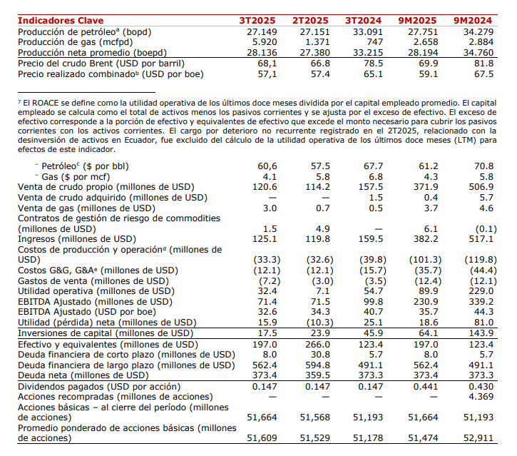 GeoPark Reporta Resultados del Tercer Trimestre de 2025Bogota, ColombiaNoviembre 5, 2025SÓLIDO DESEMPEÑO OPERACIONAL Y FINANCIERO, EN LÍNEA CON LA GUÍA PARA 2025 EXITOSA TOMA DE CONTROL DE LA OPERACIÓN DE VACA MUERTA DIVIDENDO TRIMESTRAL EN EFECTIVO DE $0.03 POR ACCIÓN SE ESTABLECE UN COMITÉ ESPECIAL DE MIEMBROS INDEPENDIENTES DEL DIRECTORIO PARA EVALUAR CUALQUIER NUEVA OFERTA DE PAREX Y OTRAS ALTERNATIVAS QUE MAXIMICEN EL VALOR PARA LA COMPAÑÍA Bogotá, Colombia – 5 de noviembre de 2025 – GeoPark Limited (“GeoPark” o la “Compañía”) (NYSE: GPRK), compañía energética independiente líder con más de 20 años de operaciones exitosas en América Latina, reporta sus resultados financieros consolidados del trimestre finalizado el 30 de septiembre de 2025 (“Tercer Trimestre” o “3T2025”). Se llevará a cabo una conferencia telefónica para comentar estos resultados el 6 de noviembre de 2025, a las 10:00 a.m. (hora estándar del Este). GeoPark registró un sólido trimestre, impulsado por una mayor producción, precios estables, y un control de costos disciplinado, en línea con la guía para 2025. La Compañía continuó fortaleciendo su balance gracias a una gestión proactiva de la deuda y una robusta generación de caja, al tiempo que impulsó sus prioridades estratégicas al completar con éxito la adquisición de Vaca Muerta y lanzar un programa renovado de dividendos. El 21 de octubre de 2025, GeoPark presentó su plan estratégico de largo plazo, sus prioridades operacionales y un marco actualizado de asignación de capital, que establece una clara estrategia de reconfiguración con dos componentes para (i) mantener una base resiliente y con altos márgenes en Colombia, y (ii) desarrollar una plataforma de crecimiento transformacional en la formación Vaca Muerta, en Argentina. El plan establece una proyección hasta 2030, con metas de producción consolidada de aproximadamente 42.000–46.000 boepd, un EBITDA Ajustado entre USD 520 y USD 550 millones, y un ratio de apalancamiento neto de 0.8–1.0x1. El fortalecimiento del balance de la Compañía y su plan estratégico de largo plazo, refuerzan el compromiso de GeoPark con un crecimiento sostenible y disciplinado, la diversificación del portafolio, el retorno para sus accionistas y la creación de valor de largo plazo. RESUMEN FINANCIERO DEL TERCER TRIMESTRE DE 2025En el 3T2025, GeoPark reportó un EBITDA Ajustado2 de USD 71,4 millones (margen del 57%), principalmente mente estable en comparación con el 2T2025. Este resultado se explica por una mayor producción durante el trimestre (28.136 boepd frente a 27.380 boepd en el 2T2025) y la estabilidad de los precios realizados (USD 57,1/bbl frente a USD 57,4/bbl en el 2T2025). Los costos operativos se mantuvieron en un competitivo nivel de USD 12,5 por barril de petróleo equivalente producido, en línea con el 2T2025 y con las proyecciones del mercado para 2025. El EBITDA Ajustado acumulado en el año ascendió a aproximadamente USD 230,0 millones, impulsado por una mayor producción y menores costos operativos y administrativos en toda la compañía, lo que refleja el impacto temprano de las iniciativas en curso de disciplina de costos y eficiencia. La utilidad neta del trimestre fue de USD 15,9 millones, en comparación con una pérdida neta de USD 10,3 millones en el 2T2025. Este resultado incluye una amortización no recurrente de USD 7,5 millones de dólares relacionada con costos de exploración incurridos en años anteriores en la cuenca Putumayo, en Colombia. Excluyendo los eventos no recurrentes de cada uno de los trimestres 2T2025 y 3T20253, la utilidad neta del 3T2025 fue de USD 23,4 millones, frente a USD 20,7 millones en el 2T2025. Los gastos de capital ascendieron a USD 17,5 millones en el 3T2025, enfocadas principalmente en mantener y mejorar la producción mediante una campaña integral de perforación y workover en el bloque Llanos 34 (operado por GeoPark, WI del 45%). Paralelamente, las actividades en los activos exploratorios de GeoPark en la cuenca Llanos avanzaron en múltiples frentes. Durante el trimestre, la Compañía avanzó en las operaciones de perforación del pozo Toritos Norte 3 en el bloque Llanos 123 (operado por GeoPark, WI del 50%) y continuó con el desarrollo de infraestructura en plataformas clave en Puerto Gaitán, estableciendo una base sólida para la próxima campaña de perforación en el bloque Llanos 104. Desde el cierre de la adquisición de Vaca Muerta, el 16 de octubre de 2025, la Compañía ha asumido las operaciones de manera segura y eficiente, garantizando una continuidad operacional sin contratiempos, y en menos de 10 días ha empezado a ejecutar su plan mediante trabajos de workover para instalar rod pumps en tres pozos del bloque Loma Jarillosa Este, con el fin de mejorar la productividad. El crudo se está comercializando localmente y ya se están llevando a cabo procesos de abastecimiento para asegurar la ejecución del plan de trabajo de 2026. Adicionalmente, la Compañía está identificando múltiples oportunidades de eficiencia de costos y sinergias para acelerar el desarrollo, optimizar los retornos y liberar valor adicional. La Compañía continuó generando un sólido flujo de caja operativo durante el trimestre, respaldado por las iniciativas de eficiencia implementadas en el 2T2025. Este buen desempeño permitió a GeoPark financiar completamente su programa de inversión, reducir deuda, distribuir dividendos y realizar un pago anticipado relacionado con la adquisición de Vaca Muerta4. Como resultado, al cierre del 3T2025, el efectivo disponible de GeoPark ascendió a USD 197,0 millones. Durante el trimestre, GeoPark recompró y pagó USD 33,0 millones del monto total de sus bonos 2030, a un precio promedio de USD 0,90 por dólar. En total, entre junio y octubre, la Compañía recompró USD 108,3 millones del monto total de sus bonos 2030, lo que se traduce en un ahorro anual en cupones