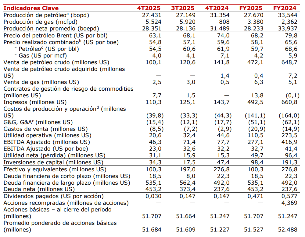 GeoPark Reporta los Resultados del Cuarto Trimestre y Resultados Anuales del 2025Bogotá, ColombiaFebrero 25, 2026Protegiendo lo que tenemos, regresando al crecimiento: Resultados de la guía anual alcanzados y reconfiguración transformacional del portafolio en plena ejecución GeoPark Limited (“GeoPark” o la “Compañía”) (NYSE: GPRK), compañía energética independiente líder con más de 20 años de operaciones exitosas en América Latina, reporta sus resultados financieros consolidados correspondientes al período de tres meses finalizado el 31 de diciembre de 2025 (“Cuarto Trimestre” o “4T2025”) y al año finalizado el 31 de diciembre de 2025 (“Año Completo” o “FY2025”). Se realizará una conferencia telefónica para discutir estos resultados el 26 de febrero de 2026 a las 10:00 a.m. (hora estándar del Este). 2025: EJECUCIÓN DISCIPLINADA EN UN ENTORNO DE PRECIOS MÁS BAJOS 2025 fue un año de transición en un entorno de precios del petróleo significativamente más bajos. El Brent promedió USD 68,2/bbl en el año completo 2025 frente a USD 79,8/bbl en el año completo 2024, y USD 63,1/bbl en el 4T2025 frente a USD 74,0/bbl en el 4T2024. En este contexto, GeoPark cumplió o superó todas las métricas clave de su guía 2025, incluyendo producción, costos operacionales e gastos de capital. La producción promedio alcanzó 28.233 boepd en el año completo 2025, por encima del rango superior de la guía de 26.000–28.000 boepd. Los costos operacionales promediaron USD 13,2/boe, dentro del rango esperado de US 12–14/boe, y los gastos de capital totalizaron USD 98,4 millones, en línea con el disciplinado programa de capital de la Compañía. Más aún, GeoPark alcanzó hitos estratégicos clave durante el año: cerró la adquisición de dos bloques de alta calidad en Vaca Muerta en octubre de 2025 e inició y avanzó negociaciones que permitieron a la Compañía acordar, en enero de 2026, la adquisición de los activos upstream en Colombia de Frontera Energy. En conjunto, estas transacciones transforman la opcionalidad del portafolio y fortalecen de manera significativa la escala, la base de reservas y la capacidad de generación de flujo de caja a largo plazo. DESEMPEÑO FINANCIERO: DISMINUCIÓN DEL EBITDA AFECTADA POR PRECIOS, MÁRGENES SE MANTIENEN RESILIENTES Los resultados del año completo 2025 reflejan principalmente menores precios realizados y, en menor medida, una menor producción promedio. El precio realizado combinado promedió USD 58,1/boe en el año completo 2025 frente a USD 65,6/boe en el año completo 2024. El EBITDA Ajustado1 totalizó USD 277,1 millones, en comparación con USD 416,9 millones en el año completo 2024. En el 4T2025, el EBITDA Ajustado fue de USD 46,3 millones (margen del 42%), frente a USD 71,4 millones en el 3T2025 y US 77,7 millones en el 4T2024. El desempeño del cuarto trimestre estuvo impactado por factores puntuales no recurrentes, incluyendo volúmenes de ventas diferidos que se espera se materialicen en el 1T2026, ajustes en gastos de venta relacionados con logística, y costos de puesta en marcha y de cierre de año asociados con la actividad de Vaca Muerta. La utilidad neta totalizó USD 31,1 millones en el 4T2025 y US 49,7 millones en el año completo 2025. El desempeño operacional en todo el portafolio se mantuvo sólido durante el año. La estabilidad de la producción estuvo respaldada por una producción base resiliente en el bloque Llanos 34, la contribución continua del bloque CPO-5 y una exitosa actividad de perforación y avanzada en el bloque Llanos 123. La Compañía operó seis equipos de perforación al cierre del año (tres de perforación y tres de workover) y perforó y completó 16 pozos durante 2025. La producción inicial de los bloques adquiridos en Vaca Muerta también contribuyó durante el cuarto trimestre. RESILIENCIA Y DISCIPLINA: REESTRUCTURACIÓN ESTRUCTURAL DE COSTOS Y FORTALECIMIENTO DEL BALANCE Reestructuración estructural de costos GeoPark logró eficiencias estructurales significativas en 2025. En el año completo 2025, los costos operacionales promediaron USD 13,2/boe (dentro del rango guía de US 12–14/boe) y los costos de estructura promediaron USD 4,8/boe. Las iniciativas implementadas durante el año generaron aproximadamente USD 32 millones en ahorros estructurales de caja, sentando las bases de una estructura de costos más baja que se espera genere aproximadamente USD 45 millones en ahorros anualizados en 2026 y hacia adelante. En el 4T2025, los costos operacionales y los costos de estructura aumentaron a USD 15,8/boe y USD 5,6/boe respectivamente, reflejando factores puntuales incluyendo reactivaciones de activos, costos de puesta en marcha y provisiones de cierre de año. Excluyendo estos conceptos, los costos operativos normalizados habrían sido aproximadamente USD 13/boe y los costos de estructura normalizados aproximadamente USD 4,5/boe, en línea con la trayectoria estructural de la Compañía. Estos impactos fueron transitorios y no modifican la base de costos subyacente con la que la Compañía inicia el 2026. Eficiencia de capital Los gastos de capital por USD 98,4 millones en el año completo 2025 se ejecutaron en línea con el plan de inversiones de la Compañía, enfocado en sostener la producción, avanzar en la recuperación secundaria y progresar en actividades de avanzada. La Compañía generó 2,8x EBITDA Ajustado en relación con los gastos de capital y alcanzó un ROACE de 18%, lo que refleja una asignación disciplinada de capital basada en retornos. Balance general y gestión de riesgos Al 31 de diciembre de 2025, el efectivo y equivalentes de efectivo fue USD 100,3 millones y el apalancamiento neto era de 1,6x, sin vencimientos de capital hasta enero de 2027. Durante el año, GeoPark recompró USD 108,3 millones de valor nominal de sus Bono 2030 por un precio inferior al valor nominal, lo que generó una ganancia de USD 10,2 millones y aprox