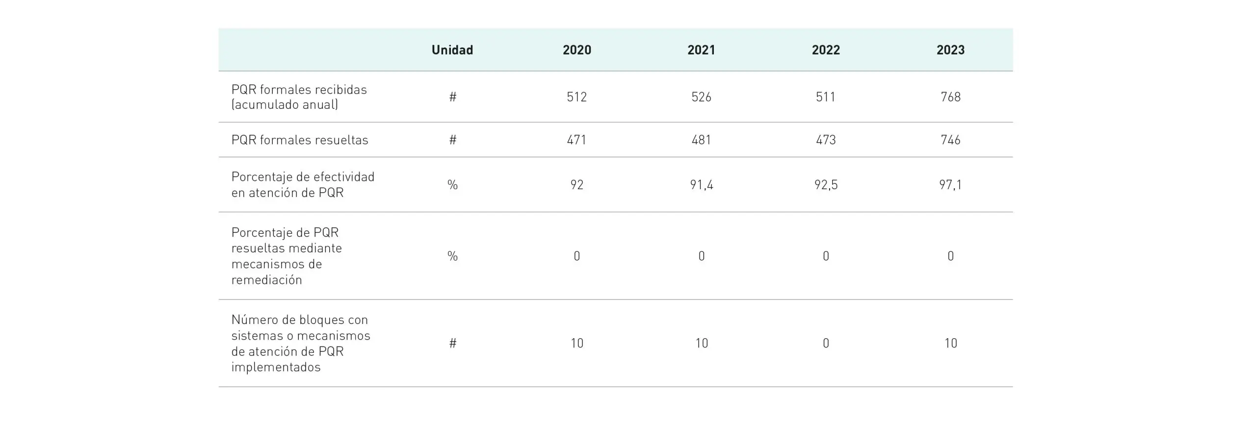 Garantizamos el registro oportuno de todas las PQR y definimos los planes de respuesta y gestión, clasificándolas y priorizándolas bajo criterios de protección de DD. HH. Estas condiciones aseguran el acceso a medios de remediación efectivos en los casos en los que haya lugar.