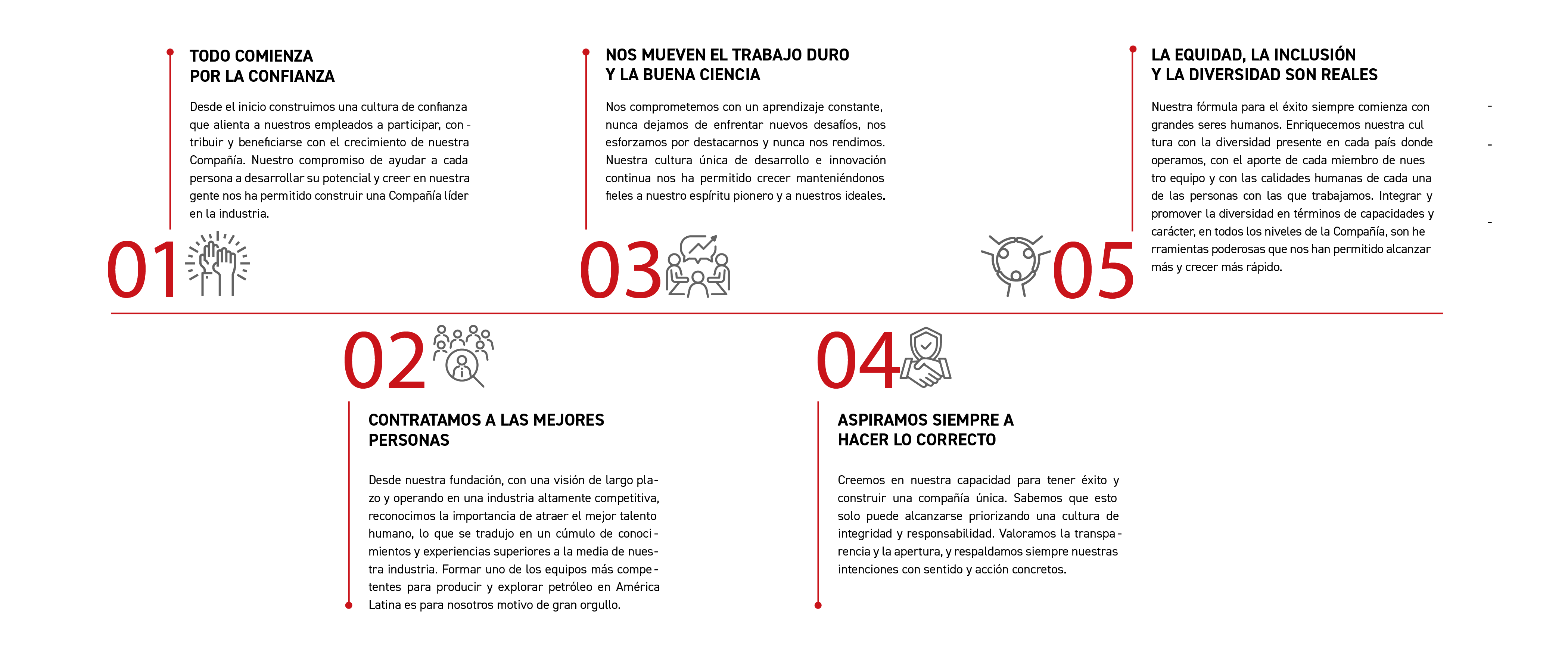 Hemos creado y fortalecido una cultura única que promueve y recompensa la calidad humana, fomenta la pasión de nuestro equipo, valora la diversidad de aportes de cada empleado y prioriza la experiencia y la ética en nuestras actividades. Nuestro compromiso es trabajar con profesionalismo e integridad, buscando la equidad y la transparencia en cada paso que damos.