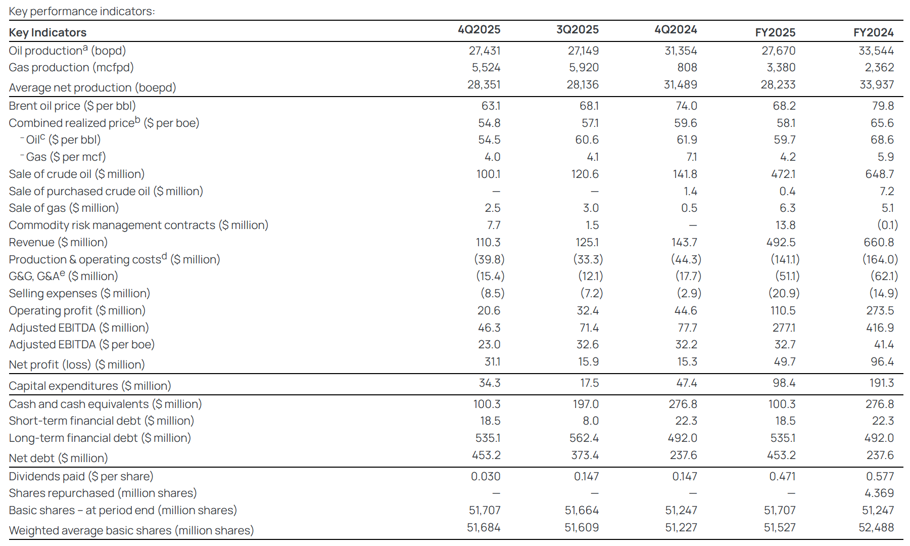 GeoPark Reports Fourth Quarter and Full-year 2025 ResultsBogota, ColombiaFebruary 25, 2026Protecting What We Have, Returning to Growth: Full-Year Guidance Delivered, Transformational Portfolio Reset Well UnderwayBOGOTA, Colombia–(BUSINESS WIRE)– GeoPark Limited (“GeoPark” or the “Company”) (NYSE: GPRK), a leading independent energy company with over 20 years of successful operations across Latin America, reports its consolidated financial results for the three-month period ended December 31, 2025 (“Fourth Quarter” or “4Q2025”) and for the year ended December 31, 2025 (“Full Year” or “FY2025”). A conference call to discuss these financial results will be held on February 26, 2026, at 10:00 am (Eastern Standard Time).2025: DISCIPLINED DELIVERY IN A LOWER PRICE ENVIRONMENT2025 was a transition year in a materially lower oil price environment. Brent averaged $68.2/bbl in FY2025 versus $79.8/bbl in FY2024, and $63.1/bbl in 4Q2025 versus $74.0/bbl in 4Q2024. In this context, GeoPark delivered or exceeded all key 2025 guidance metrics, including production, operating costs and capital expenditures. Average production reached 28,233 boepd in FY2025, above the upper end of the Company’s 26,000–28,000 boepd guidance range. Operating costs averaged $13.2/boe, within the $12–14/boe guidance range, and capital expenditures totaled $98.4 million, consistent with the Company’s disciplined capital program.GeoPark furthermore executed key strategic milestones during the year: closing the acquisition of two high-quality Vaca Muerta blocks in October 2025 and initiating and advancing negotiations which allowed the Company to agree, in January 2026 to acquire Frontera Energy’s Colombian upstream assets. Together, these transactions transform portfolio optionality and materially enhance scale, reserve base, and long-term cash flow capacity.FINANCIAL PERFORMANCE: PRICE-DRIVEN EBITDA DECLINE; MARGINS REMAIN RESILIENTFY2025 results primarily reflect lower realized prices and, to a lesser extent, lower average production. Combined realized price averaged $58.1/boe in FY2025 versus $65.6/boe in FY2024. Adjusted EBITDA1 totaled $277.1 million compared to $416.9 million in FY2024. In 4Q2025, Adjusted EBITDA was $46.3 million (42% margin), compared to $71.4 million in 3Q2025 and $77.7 million in 4Q2024. Fourth Quarter performance was impacted by identifiable, non-recurring items, including deferred sales volumes expected to be realized in 1Q2026, logistics-related selling expense adjustments, and start-up and year-end costs associated with Vaca Muerta activity. Net profit totaled $31.1 million in 4Q2025 and $49.7 million for FY2025.Operational performance across the portfolio remained solid during the year. Production stability was supported by resilient base production in the Llanos 34 Block, continued contribution from the CPO-5 Block, and successful drilling and appraisal activity in the Llanos 123 Block. The Company operated six rigs at year-end (three drilling and three workover) and drilled and completed 16 wells during 2025. Initial production from the acquired Vaca Muerta blocks also contributed during the Fourth Quarter.RESILIENCE AND DISCIPLINE: STRUCTURAL COST RESET AND BALANCE SHEET STRENGTHStructural cost resetGeoPark delivered meaningful structural efficiencies in 2025. FY2025 operating costs averaged $13.2/boe (within guidance of $12–14/boe) and structure costs averaged $4.8/boe. Initiatives implemented during the year generated approximately $32 million in structural cash cost savings, establishing a lower cost base expected to generate approximately $45 million in annualized savings into 2026 and beyond. In 4Q2025, operating costs and structure costs increased to $15.8/boe and $5.6/boe, respectively, reflecting identifiable one-off items including asset reactivations, start-up costs and year-end accruals. Excluding these items, normalized operating costs would have been approximately $13/boe and normalized structure cost approximately $4.5/boe, consistent with the Company’s structural trajectory. These impacts were transitory and do not alter the underlying cost base entering 2026.Capital efficiencyCapital expenditures of $98.4 million in FY2025 were deployed in line with the Company’s capital expenditure plan, focused on sustaining production, advancing secondary recovery and progressing appraisal activity. The Company generated 2.8x Adjusted EBITDA relative to capital expenditures and delivered 18% ROACE, underscoring disciplined, returns-based capital allocation.Balance sheet and risk managementAt December 31, 2025, cash and cash equivalents were $100.3 million and net leverage was 1.6x, with no principal maturities until January 2027. During the year, GeoPark repurchased $108.3 million principal amount of its 2030 Notes below par, generating a $10.2 million gain and approximately $9.5 million in annual cash interest savings. Approximately 84% of expected 2026 production has been hedged through three-way collars. Hedging has also been initiated for 2027, covering approximately 71% of expected 1Q2027 production and 60% of expected 2Q2027 production.TRANSFORMATIONAL PORTFOLIO RESET WELL UNDERWAY: STRENGTHENING SCALE AND COMPETITIVENESSDuring 2025, GeoPark executed a decisive portfolio reset under its strategy of Protecting What We Have and Returning to Growth, reinforcing its Colombian cash-generating base while establishing a new unconventional growth engine in Vaca Muerta, Argentina.In October 2025, GeoPark closed the acquisition of two high-quality blocks in Vaca Muerta, securing a 100% WI in the Loma Jarillosa Este Block and 95% in the Puesto Silva Oeste Block, totaling more than 12,300 gross acres in the black oil window. The assets add 11.1 mmboe of 1P net reserves, 36.7 mmboe of 2P net reserves and 71.1 mmboe of 3P net reserves, with a clear development path toward approximately 20,000 boepd plateau production by year-end 2028, establishing a scala